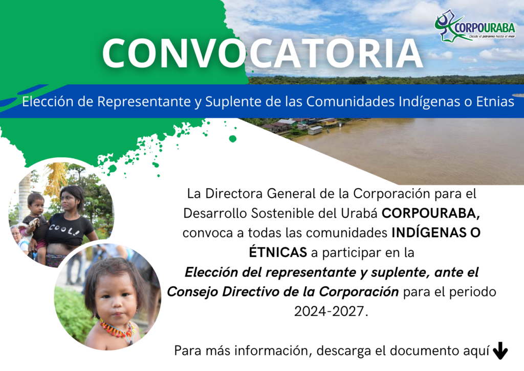 Se permite invitar a todas las COMUNIDADES INDÍGENAS O· ETNIAS, tradicionalmente asentadas en el área de jurisdicción territorial de la Corporación para el Desarrollo Sostenible del Urabá – CORPOURABA a participar el día 08 de septiembre de 2023, a las 9:00 a.m., se hagan presente en el Auditorio de CORPOURABA ubicado en la Calle 92 Nº 98-39, Barrio Manzanares del Municipio de Apartadó, a la reunión de elección de su representante y su respectivo suplente ante el Consejo Directivo de CORPOURABA para el periodo comprendido del 1 de enero de 2024 al día 31 de diciembre del año 2027.