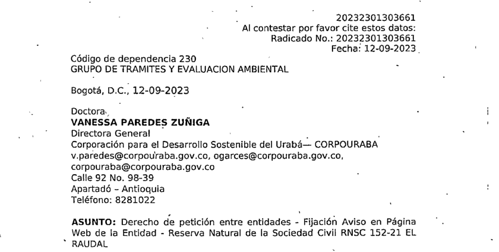 El 13 de diciembre de 2021, el señor SANTIAGO GUTIÉRREZ POSADA identificado con cédula de ciudadanía No. 1.039.023.383, en nombre de la señora IBETH PATRICIA POSADA CÁRDENAS identificada con cédula de ciudadanía No 42.880.483, solicitó ante Parques Nacionales Naturales de Colombia, el registro a favor del predio denominado «Lote Tres El Raudal» inscrito bajo el folio de matrícula inmobiliaria No. 007-45747, ubicado en la vereda Villa Arteaga, municipio de Mutatá, departamento de Antioquia, como Reserva Natural de la Sociedad Civil «EL RAUDAL». RNSC 152-21.
