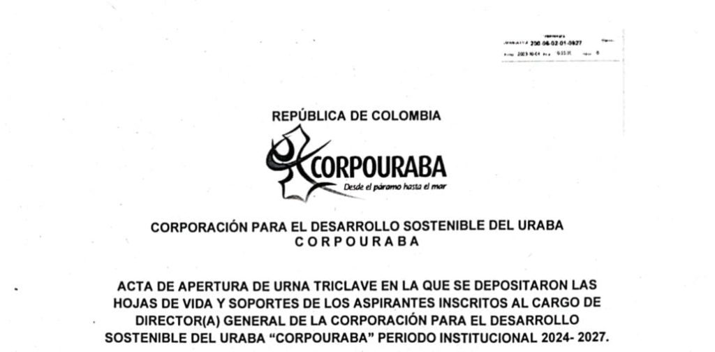 Acta de apertura de urna triclave en la que se depositaron las hojas de vida y soportes de los aspirantes inscritos al cargo de Director (a) General de la Corporación para el Desarrollo Sostenible del Urabá «CORPOURABA» periodo institucional 2024 -2027