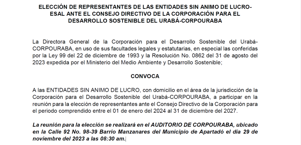CONVOCA A las ENTIDADES SIN ÁNIMO DE LUCRO, con domicilio en el área de la jurisdicción de la Corporación para el Desarrollo Sostenible del Urabá-CORPOURABA, a participar en la reunión para la elección de representantes ante el Consejo Directivo de la Corporación para el periodo comprendido entre el 01 de enero del 2024 al 31 de diciembre del 2027. La reunión para la elección se realizará en el AUDITORIO DE CORPOURABA, ubicado en la Calle 92 No. 98-39 Barrio Manzanares del Municipio de Apartadó el día 29 de noviembre del 2023 a las 08:30 am.