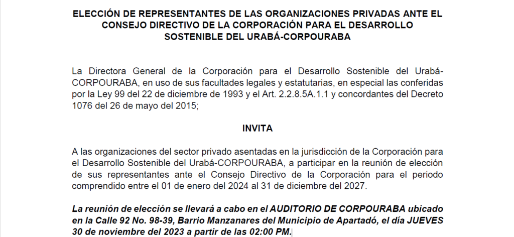 La Directora General de la Corporación para el Desarrollo Sostenible del Urabá-CORPOURABA, en uso de sus facultades legales y estatutarias, en especial las conferidas por la Ley 99 del 22 de diciembre de 1993 y el Art. 2.2.8.5A.1.1 y concordantes del Decreto 1076 del 26 de mayo del 2015; INVITA A las organizaciones del sector privado asentadas en la jurisdicción de la Corporación para el Desarrollo Sostenible del Urabá-CORPOURABA, a participar en la reunión de elección de sus representantes ante el Consejo Directivo de la Corporación para el periodo comprendido entre el 01 de enero del 2024 al 31 de diciembre del 2027. La reunión de elección se llevará a cabo en el AUDITORIO DE CORPOURABA ubicado en la Calle 92 No. 98-39, Barrio Manzanares del Municipio de Apartadó, el día JUEVES 30 de noviembre del 2023 a partir de las 02:00 PM.