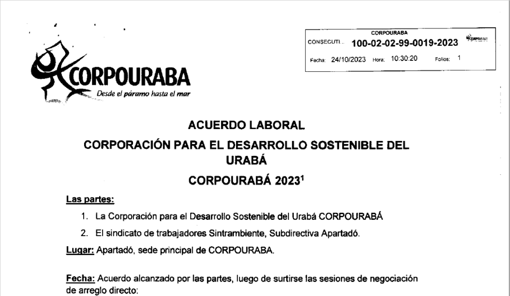Acuerdo Laboral CORPOURABA- SINTRAMBIENTE Subdirectiva Apartadó 2023