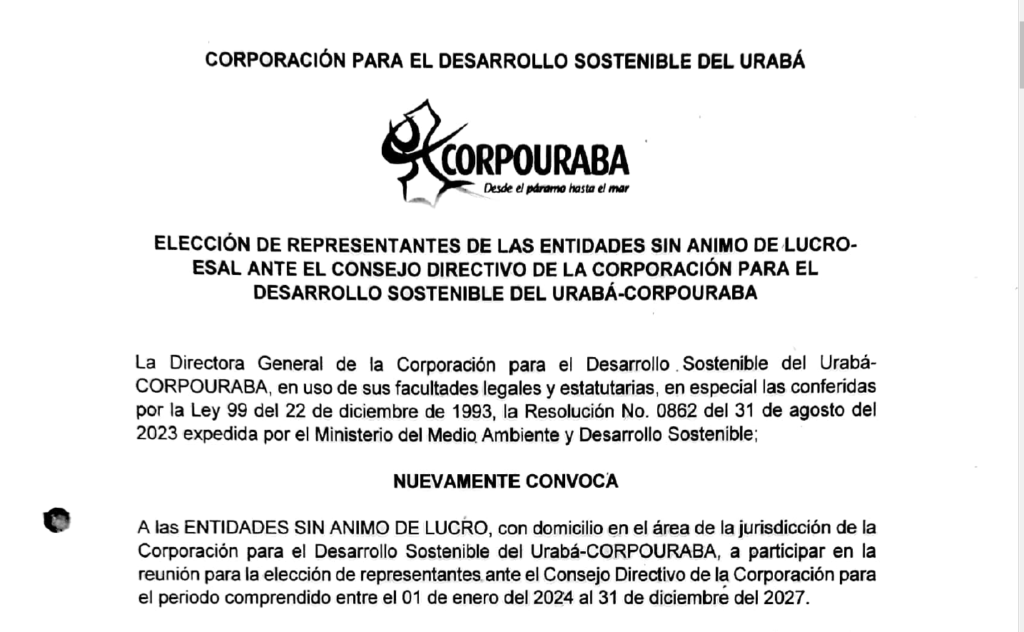 A las ENTIDADES SIN ANIMO DE LUCRO, con domicilio en el área de la jurisdicción de la Corporación para el Desarrollo Sostenible del Urabá-CORPOURABA, a participar en la reunión para la elección de representantes ante el Consejo Directivo de la Corporación para el periodo comprendido entre el 01 de enero del 2024 al 31 de diciembre del 2027.
