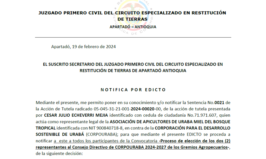 Se notifica a todos los participantes del proceso de elección de los dos (2) representantes de Gremios Agropecuarios para el Consejo Directivo 2024-2027 la Sentencia No. 0021 del 2024 del Juzgado 1° Civil del Circuito Especializado en Restitución de Tierras de Apartadó, decisión de primera instancia en el marco del proceso de Acción de Tutela con Radicado No. 05-045-31-21-001-2024-00020-00.