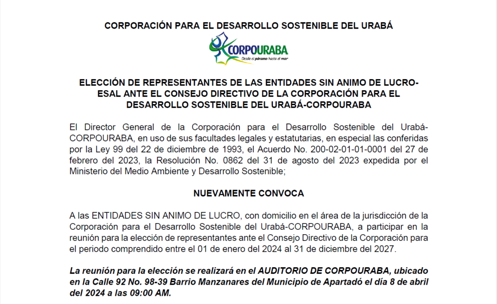 El director general de CORPOURABA convoca nuevamente a ENTIDADES SIN ÁNIMO DE LUCRO, con domicilio en el área de la jurisdicción de la Corporación para el Desarrollo Sostenible del Urabá-CORPOURABA, a participar en la reunión para la elección de representantes ante el Consejo Directivo de la Corporación, para el periodo comprendido entre el 01 de enero del 2024 al 31 de diciembre del 2027.