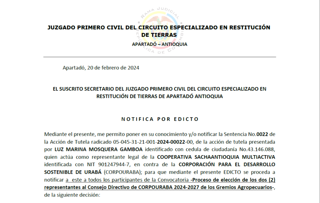 CORPOURABA notifica a todos los participantes del proceso de elección de los dos (2) representantes de Gremios Agropecuarios para el Consejo Directivo 2024-2027, la Sentencia No. 0022 del 2024 establecida por el Juzgado 1° Civil del Circuito Especializado en Restitución de Tierras de Apartadó, la decisión de primera instancia en el marco del proceso de Acción de Tutela con Radicado No. 05-045-31-21-001-2024-00022-0.