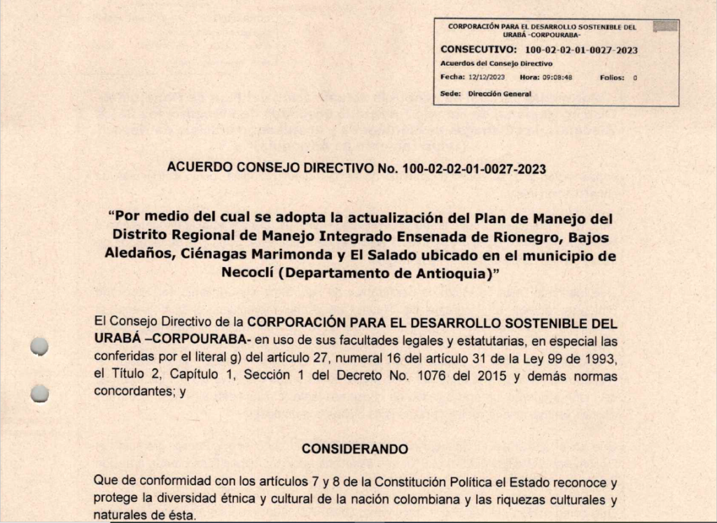 Acuerdo Nº 0027-2023 por medio del cual se adopta la actualización del Plan de Manejo del Distrito Regional de Manejo Integrado Ensenada de Rionegro, los Bajos Aledaños, las Ciénagas de Marimonda y El Salado en el municipio de Necoclí, Antioquia