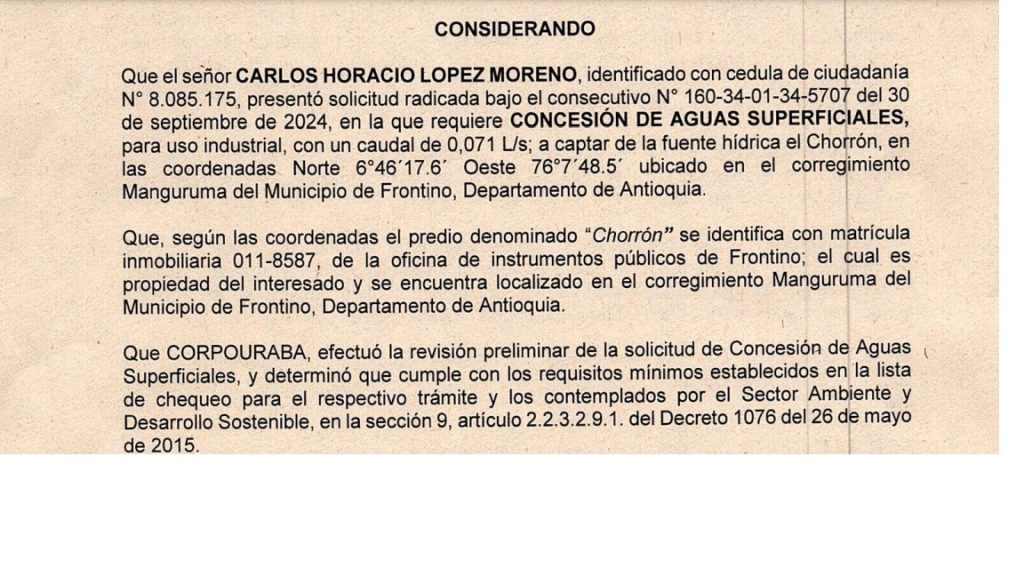 «Por el cual se declara iniciada la actuación administrativa ambiental». La Secretaría General de la Corporación Para el Desarrollo Sostenible del Urabá CORPOURABA, en uso de sus facultades legales y estatutarias en especial conferidas en la resolución N°100-03-10-01-0924 del 7 de junio del 2024, en concordancia con el Acta de posesión N°100-01-04-22-1043 del 11 de junio de 2024, la Resolución N°11-03-10-99-0516 del 9 de abril del 2024, mediante la cual se delegan sus funciones en funcionarios del nivel directivo de la Corporación, con fundamento en los dispuesto en la ley 1437 del 2011 -CPACA-, en coherencia con las disposiciones contenidas en el Decreto Ley 2811 1974, Ley de 1993, Decreto único reglamentario 1076 de 2015.