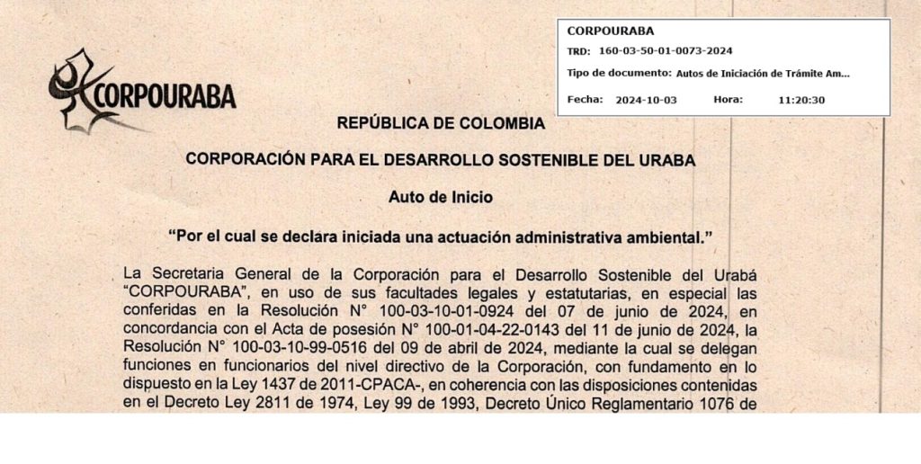 «Por el cual se declara iniciada la actuación administrativa ambiental». La Secretaría General de la Corporación Para el Desarrollo Sostenible del Urabá CORPOURABA, en uso de sus facultades legales y estatutarias en especial conferidas en la resolución N°100-03-10-01-0924 del 7 de junio del 2024, en concordancia con el Acta de posesión N°100-01-04-22-1043 del 11 de junio de 2024, la Resolución N°11-03-10-99-0516 del 9 de abril del 2024, mediante la cual se delegan sus funciones en funcionarios del nivel directivo de la Corporación, con fundamento en los dispuesto en la ley 1437 del 2011 -CPACA-, en coherencia con las disposiciones contenidas en el Decreto Ley 2811 1974, Ley de 1993, Decreto único reglamentario 1076 de 2015.