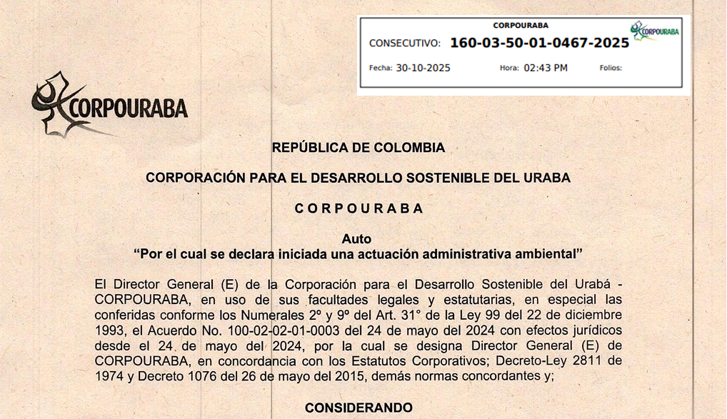 CORPOURABA, por medio del AUTO No. 0467 de 2025, declara iniciada la actuación administrativa ambiental con el fin de evaluar la solicitud de APROVECHAMIENTO FORESTAL DE ARBOLES AISLADOS, respecto de las especies y volúmenes que se indican en el presente documento, según solicitud presentada por el señor DIEGO FERNANDO ESTRADA RINCON, identificado con CC. 79.481.576, a realizarse en el predio identificado con matrícula inmobiliaria No. 024-738, denominado Cuajaron, ubicado en la vereda Cuajaron en jurisdicción del Municipio de Giraldo del Departamento de Antioquia.
