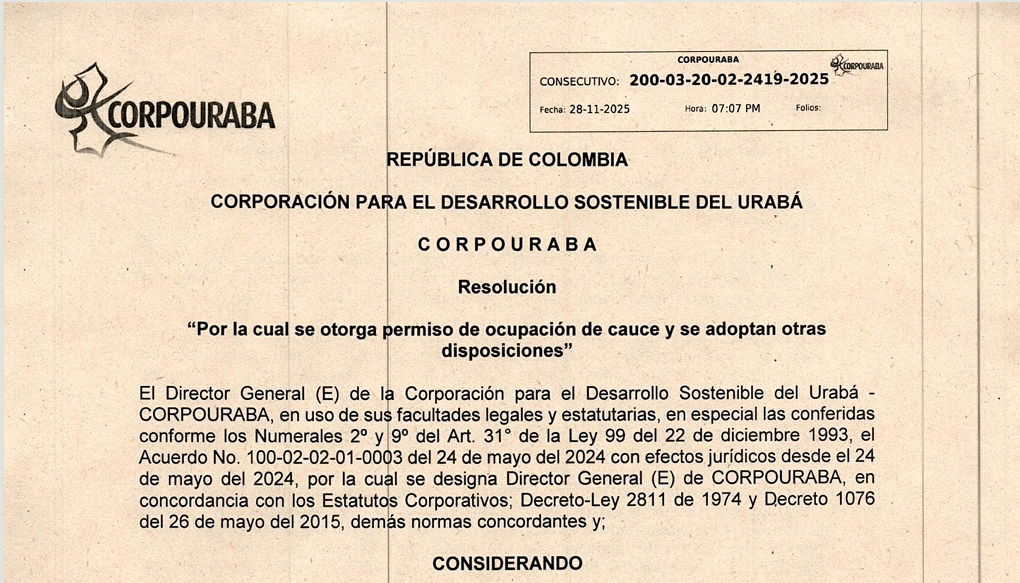 CORPOURABÁ, por medio de la Resolución No. 2419 de 2025, otorga permiso al Consorcio DBS MAZI ASDELOGY 15, identificado con NIT 901.875.677-9, para realizar la OCUPACIÓN DE CAUCE DE CARÁCTER PERMANENTE sobre la ronda hídrica del río Mulatos, perteneciente a la cuenca del rio Mulatos, ubicada en la vía que conduce del municipio de Necoclí al municipio de Arboletes, en jurisdicción del municipio de Necoclí, departamento de Antioquia, con el fin de llevar a cabo la CONSTRUCCIÓN DE OBRAS DE PROTECCIÓN, en las coordenadas geográficas No. 8° 31’ 18”  W: 76° 41’ 24,1”, conforme a las características señaladas en el documento respectivo.