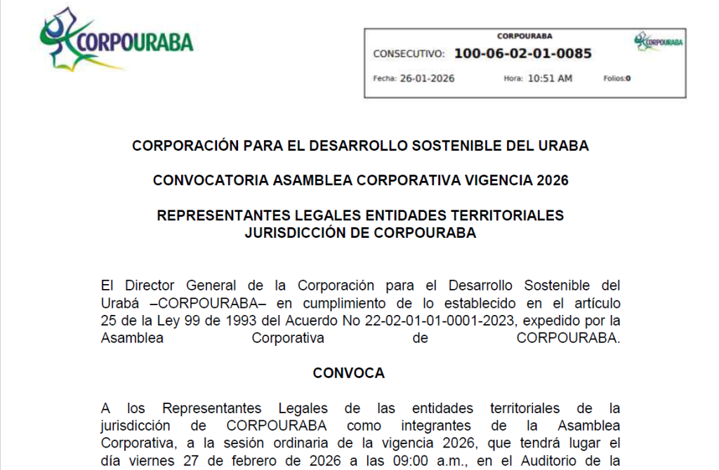 CORPOURABA convoca a los Representantes Legales de las entidades territoriales de su jurisdicción a participar en la Sesión Ordinaria de la Asamblea Corporativa – Vigencia 2026, en cumplimiento de lo establecido en la Ley 99 de 1993 y los Estatutos Corporativos.
