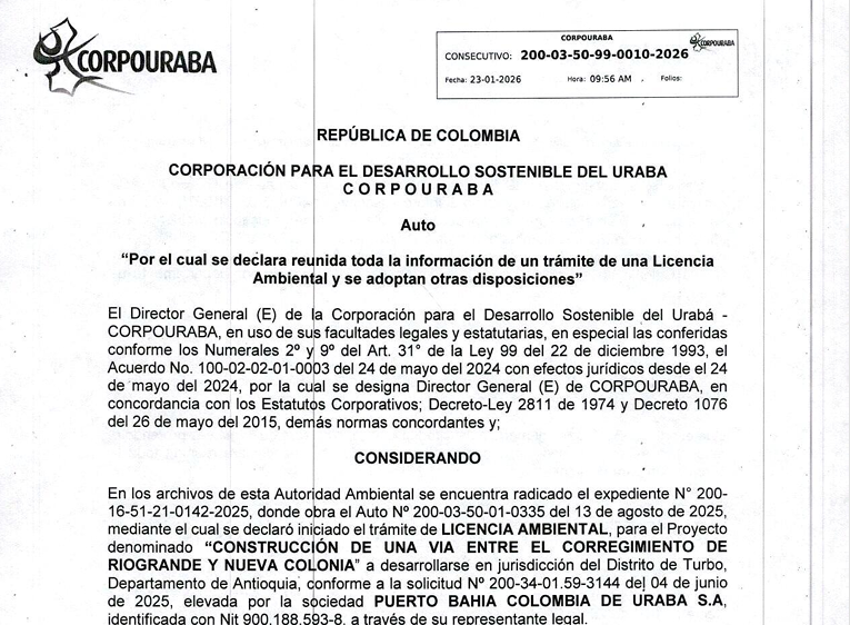 La Corporación para el Desarrollo Sostenible del Urabá – CORPOURABA informa a la comunidad la expedición de los siguientes autos y resoluciones dentro de actuaciones administrativas relacionadas con trámites ambientales, medidas preventivas, investigaciones sancionatorias, aprovechamientos forestales y archivo de expedientes: Auto 0010-2026 del 23 de enero de 2026; Resoluciones 0041-2026, 0044-2026 y 0085-2026 del 08 y 13 de enero de 2026; Autos 0041-2026, 0042-2026, 0043-2026 y 0044-2026 del 01 y 02 de marzo de 2026; Autos 0291-2022 y 0292-2022 del 08 de agosto de 2022; Resoluciones 0364-2026 y 0368-2026 del 02 de marzo de 2026; Resolución 0696-2025 del 28 de abril de 2025; Resolución 2387-2025 del 24 de noviembre de 2025; y Resolución 2422-2025 del 29 de noviembre de 2025.